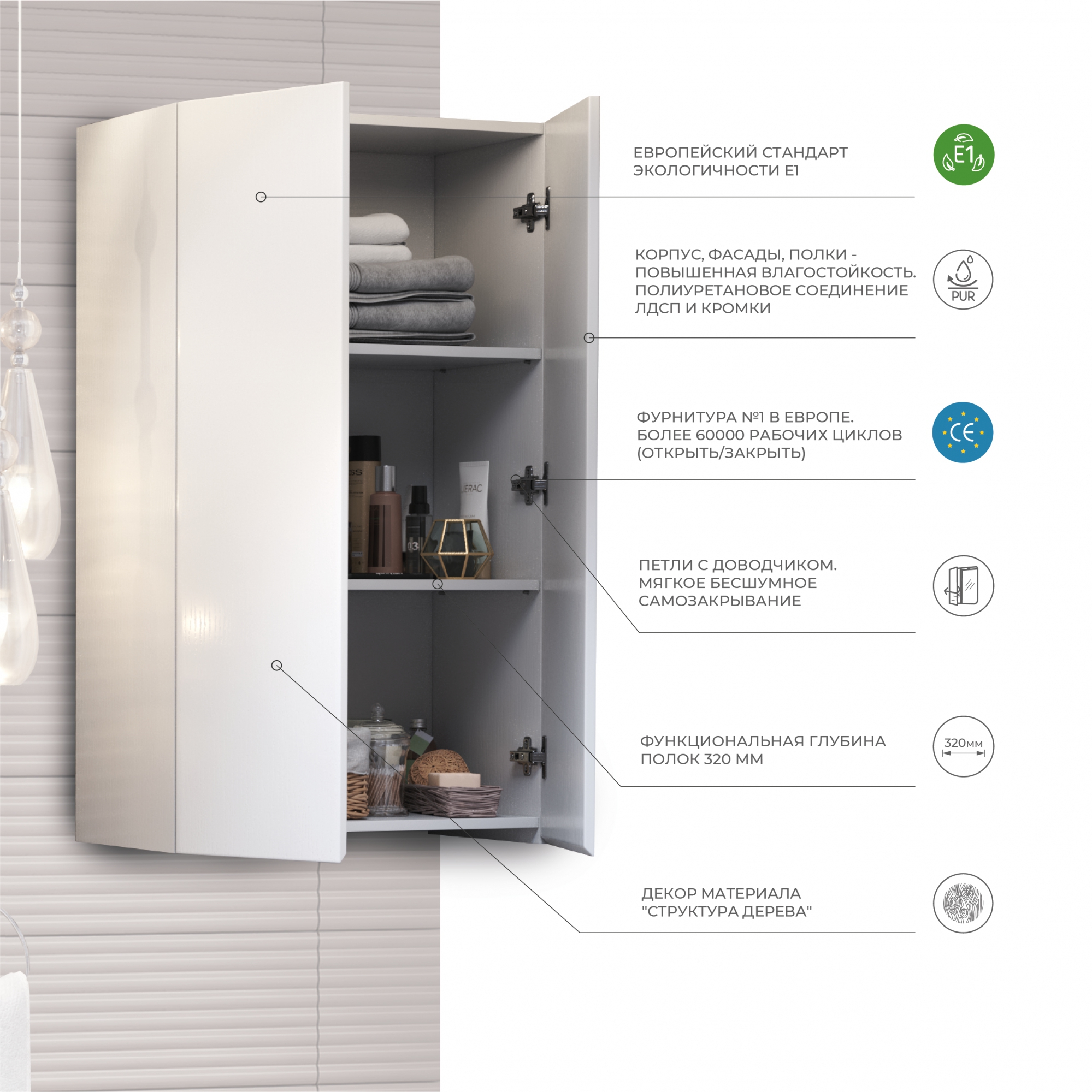 Влагостойкая ЛДСП - это лист ДСП, облицованный при сверхвысоких температурах меламиновой пленкой в один или несколько слоев. ЛДСП бывает покрыта специальным лаком, который придает ей больший блеск и долговечность. Влагостойкая ЛДСП - это современный высокотехнологичный материал широкой используемый в производстве мебели для ванной. Этот материал совершенно не подвержен реакции на перепады температур и высокую влажность. Кроме того, влагостойкая ЛДСП имеет идеально ровную поверхность, что позволяет изделиям из нее сохранять первоначальный внешний вид очень долгое время.