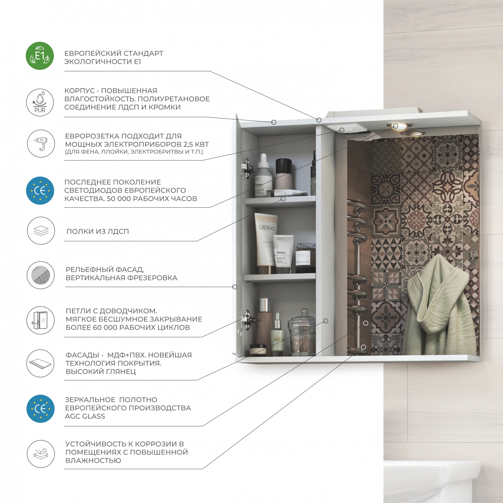 Зеркало зрительно увеличивает пространство, а подсветка добавляет ощущение уюта и камерности. Пригодится во время бритья, укладки волос и косметических процедур.