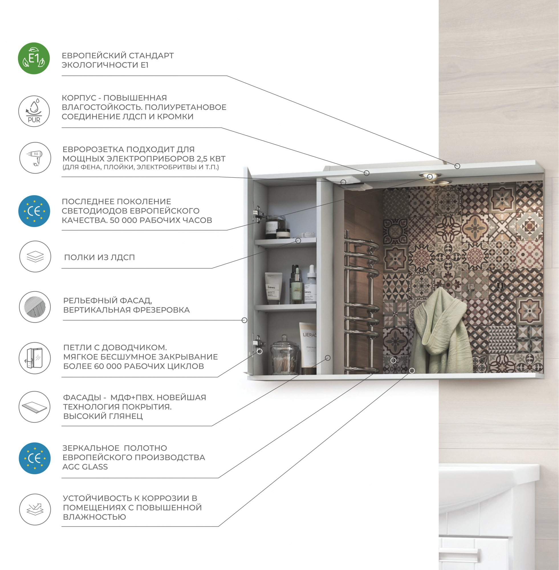 Зеркало зрительно увеличивает пространство, а подсветка добавляет ощущение уюта и камерности. Пригодится во время бритья, укладки волос и косметических процедур.